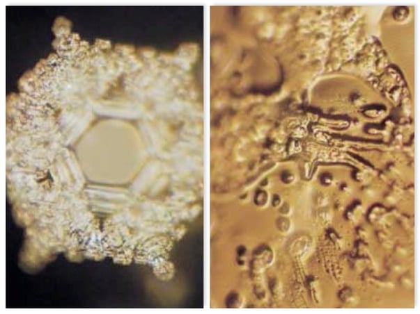 These water crystals were created by producing different focused intentions through written and spoken words as well as music, then literally presenting it to the same water samples, the water appears to “change its expression”.