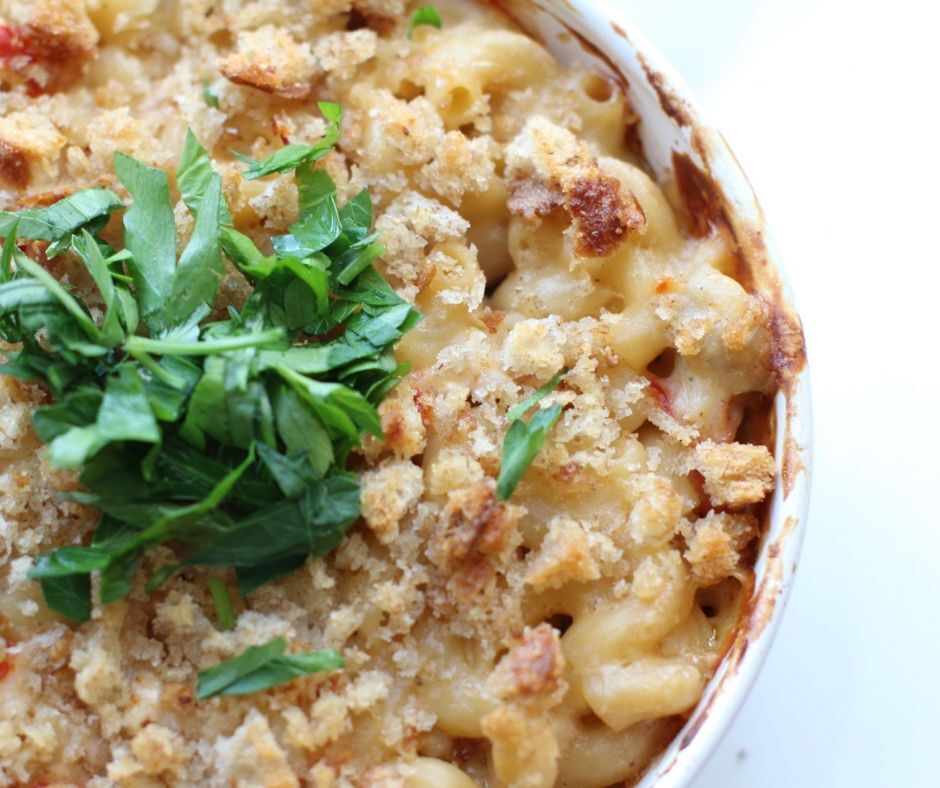 Once pasta is fully cooked, begin assembly. Add a layer of pasta on the bottom of the casserole dish. Follow with a layer of the combined cheeses and ½ of the cream sauce. Repeat same step again- only this time putting a final layer of cheese and panko on top to make a crispy crust. Place in the oven covered for 35 to 45 minutes to allow the pasta to absorb some of the sauce. Remove foil and allow to cook for another 10 minutes to turn to a golden brown on top.
